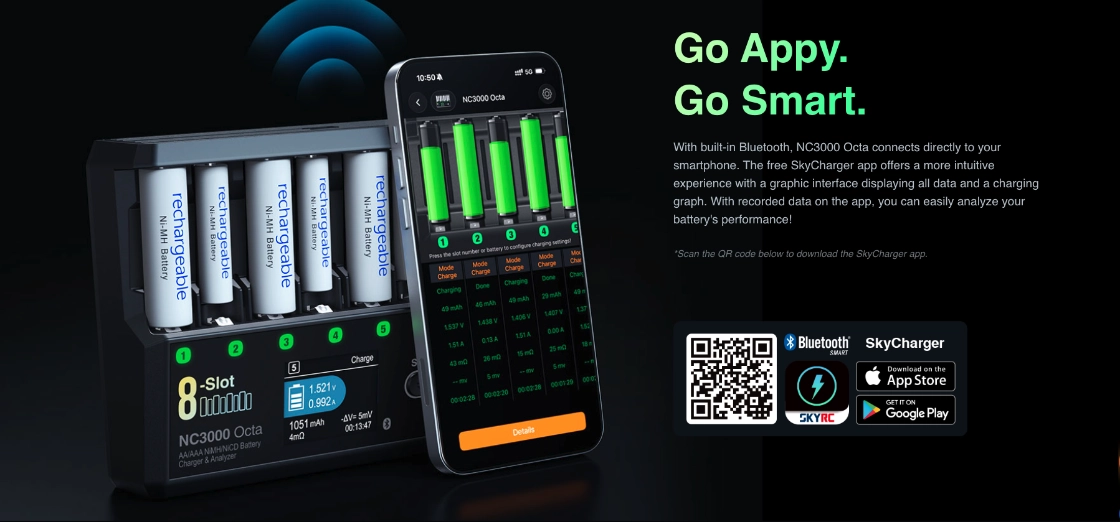 Featuring eight independent AA/AAA slots, each with its own charging mode, SkyRc NC3000 Octa gives you complete control—from fast power to precise battery management.